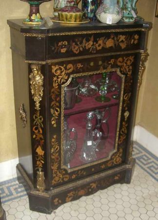 Marquetry inlaid one glass door cabinet with ormolu - 41" tall by 29" wide by 16" deep Marquetry inlaid one glass door cabinet with ormolu - 41" tall by 29" wide by 16" deep