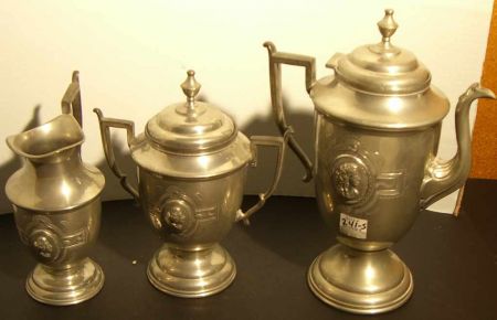 3 pc coffee set with applied medallion of Victorian lady, consistent of coffee pot, sugar and creamer. 3 pc coffee set with applied medallion of Victorian lady, consistent of coffee pot, sugar and creamer.