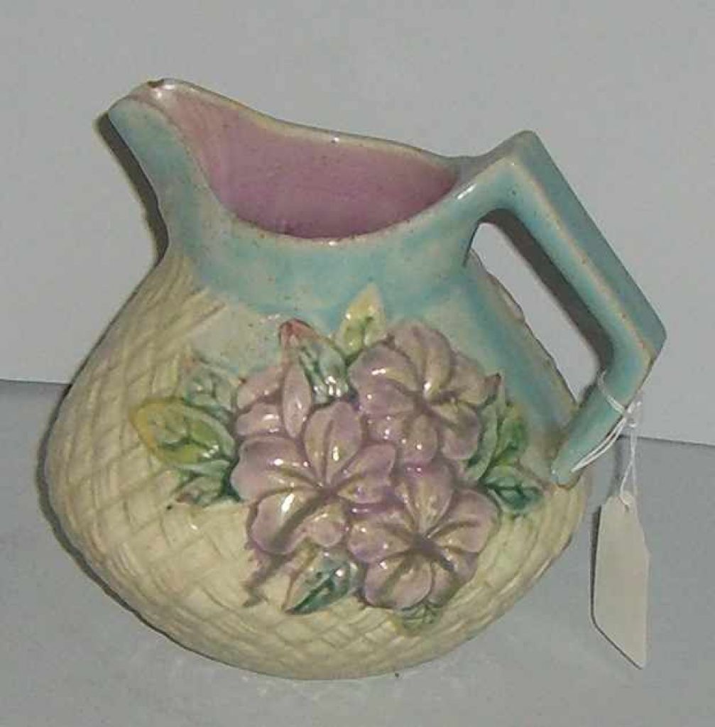 Small Majolica pitcher with purple flowers Attributed to George Jones - 5" tall Small Majolica pitcher with purple flowers Attributed to George Jones - 5" tall