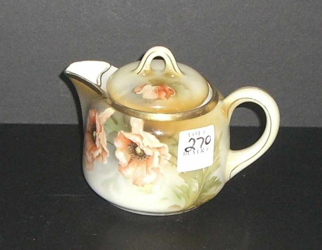 RS Germany creamer gold with pink flowers - 5" from spout to handle - 3 1/2" from back to front - 4" tall RS Germany creamer gold with pink flowers - 5" from spout to handle - 3 1/2" from back to front - 4" tall
