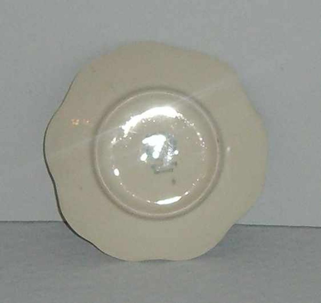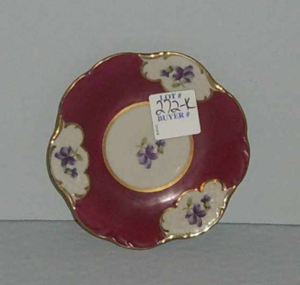 Small hand painted red & gold demi saucer with purple flowers - 4" round Small hand painted red & gold demi saucer with purple flowers - 4" round