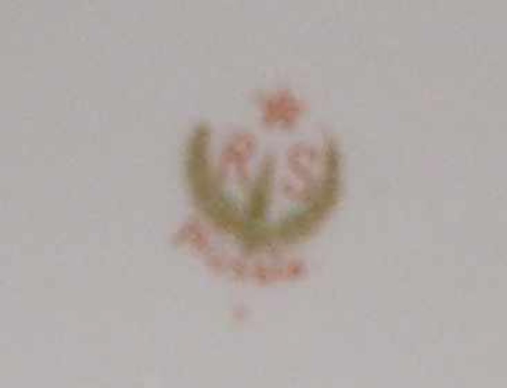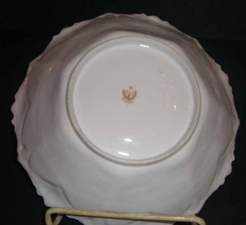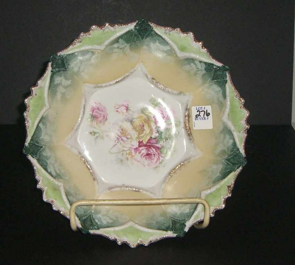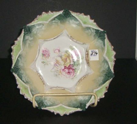 RS Prussia hand painted bowl with flowers green & gold with pink & yellow flowers - 9" round by 3" deep RS Prussia hand painted bowl with flowers green & gold with pink & yellow flowers - 9" round by 3" deep