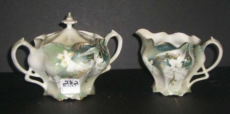 RS Prussia hand painted creamer & sugar, green with gold trim RS Prussia hand painted creamer & sugar, green with gold trim