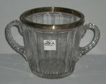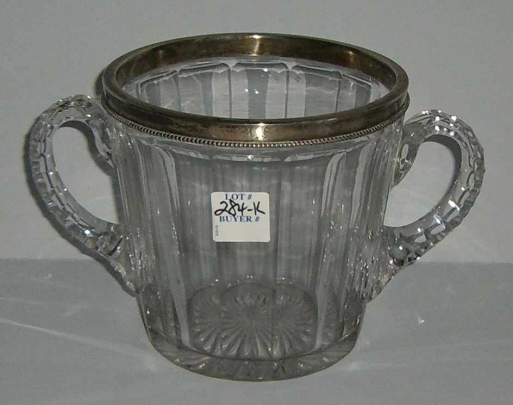 Cut glass ice tub with double handles & sterling ring top - 9" length by 6" width by 5" height Cut glass ice tub with double handles & sterling ring top - 9" length by 6" width by 5" height
