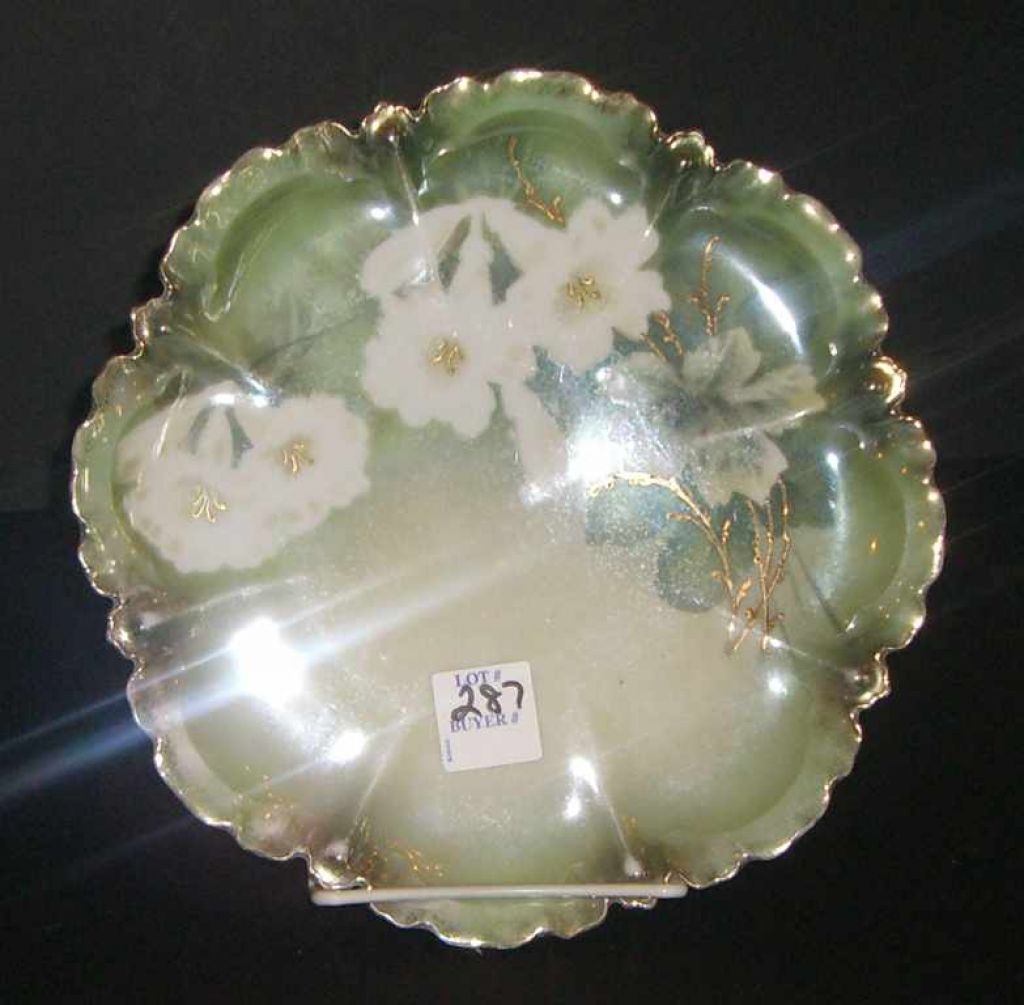 RS Prussia hand painted plate, Green & gold trim with white flowers - 8 1/2" round RS Prussia hand painted plate, Green & gold trim with white flowers - 8 1/2" round