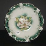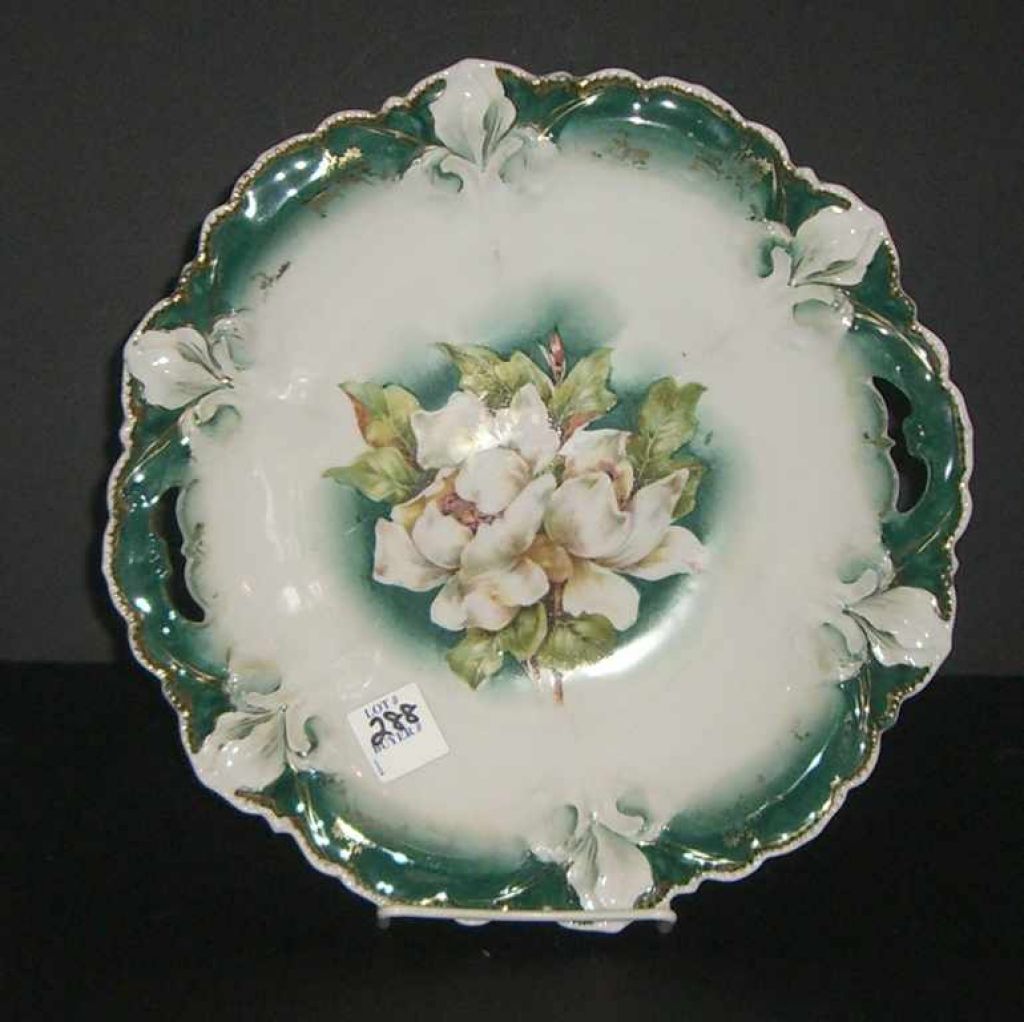 Wheelock Prussia hand painted plate, green & gold trim Magnolia flowers - 10 1/2" round Wheelock Prussia hand painted plate, green & gold trim Magnolia flowers - 10 1/2" round