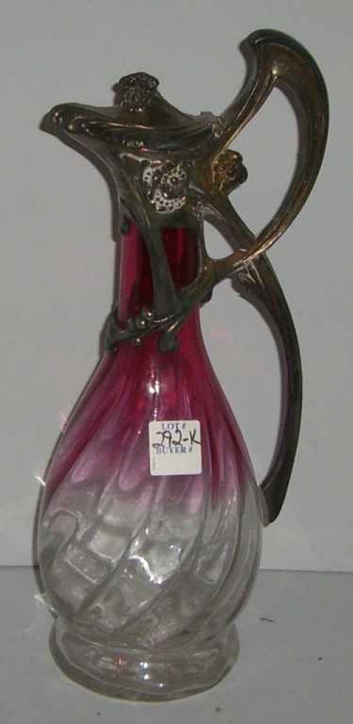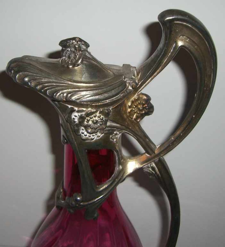 Art Nouveau Rubina pitcher, cranberry & clear with silver plate handle, floral - 13" tall Art Nouveau Rubina pitcher, cranberry & clear with silver plate handle, floral - 13" tall
