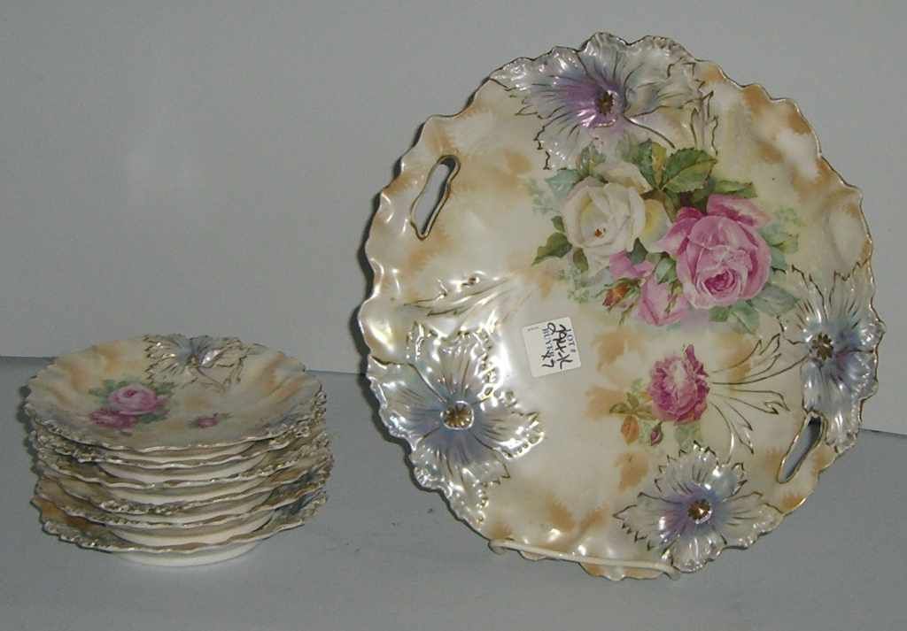 2701 RS Prussia cake plate & 6 dessert plates pink flowers