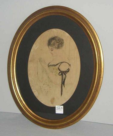 Oval gold frame hand drawn picture of lady by Harrison Fisher dated 1908. Oval gold frame hand drawn picture of lady by Harrison Fisher dated 1908.