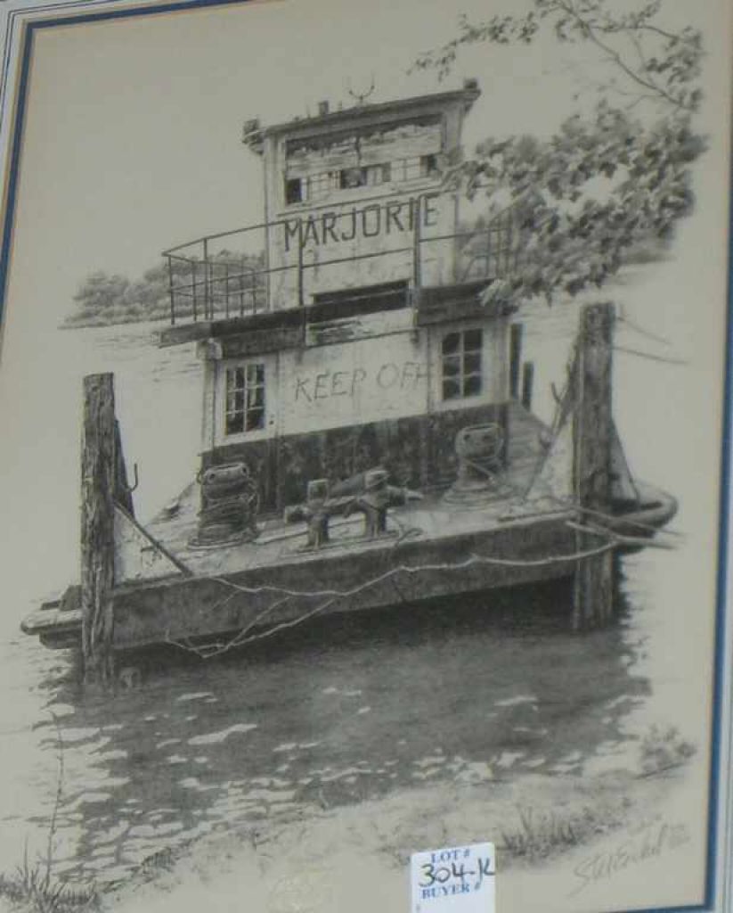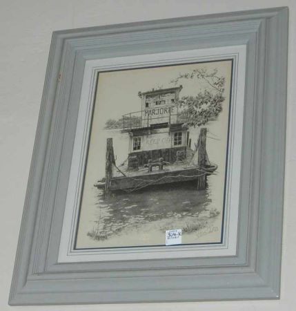 Drawing of boat "Marjore" in water black & white - 17" width x 20" length Drawing of boat "Marjore" in water black & white - 17" width x 20" length