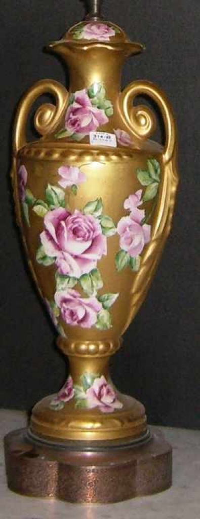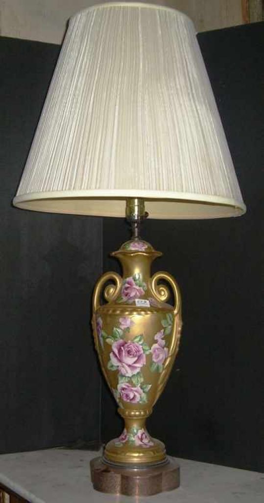 Large Table Lamp, Gilt Body w/Pink Roses on Copper Base. 33" tall Large Table Lamp, Gilt Body w/Pink Roses on Copper Base. 33" tall