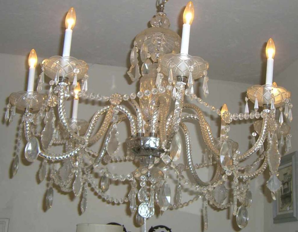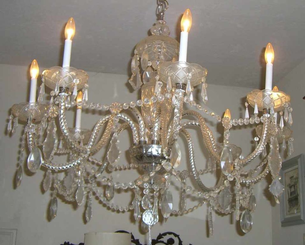 Large crystal arms, prisms, & chains. 8 light chandelier - 34" tall by 41" wide Large crystal arms, prisms, & chains. 8 light chandelier - 34" tall by 41" wide