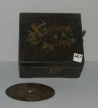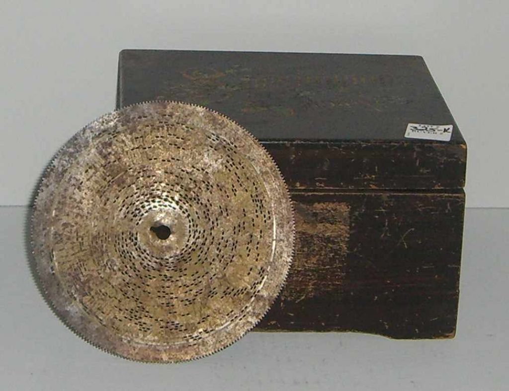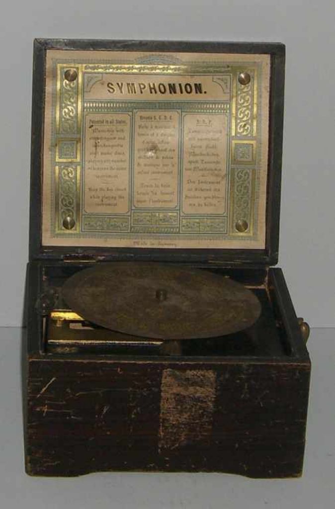Symphonion made in Germany disc player with 6 disc. LID OF PLAYER IS BROKEN WHERE THE HINGES ARE. Top of box says "Symphonion Simplex". Does work but needs some work. Symphonion made in Germany disc player with 6 disc. LID OF PLAYER IS BROKEN WHERE THE HINGES ARE. Top of box says "Symphonion Simplex". Does work but needs some work.