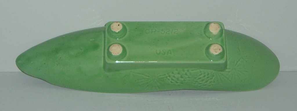 Green pottery long center bowl with pine cone & needle design. Bottom says CP 5212 USA - 18" by 5" by 3 1/2" Green pottery long center bowl with pine cone & needle design. Bottom says CP 5212 USA - 18" by 5" by 3 1/2"
