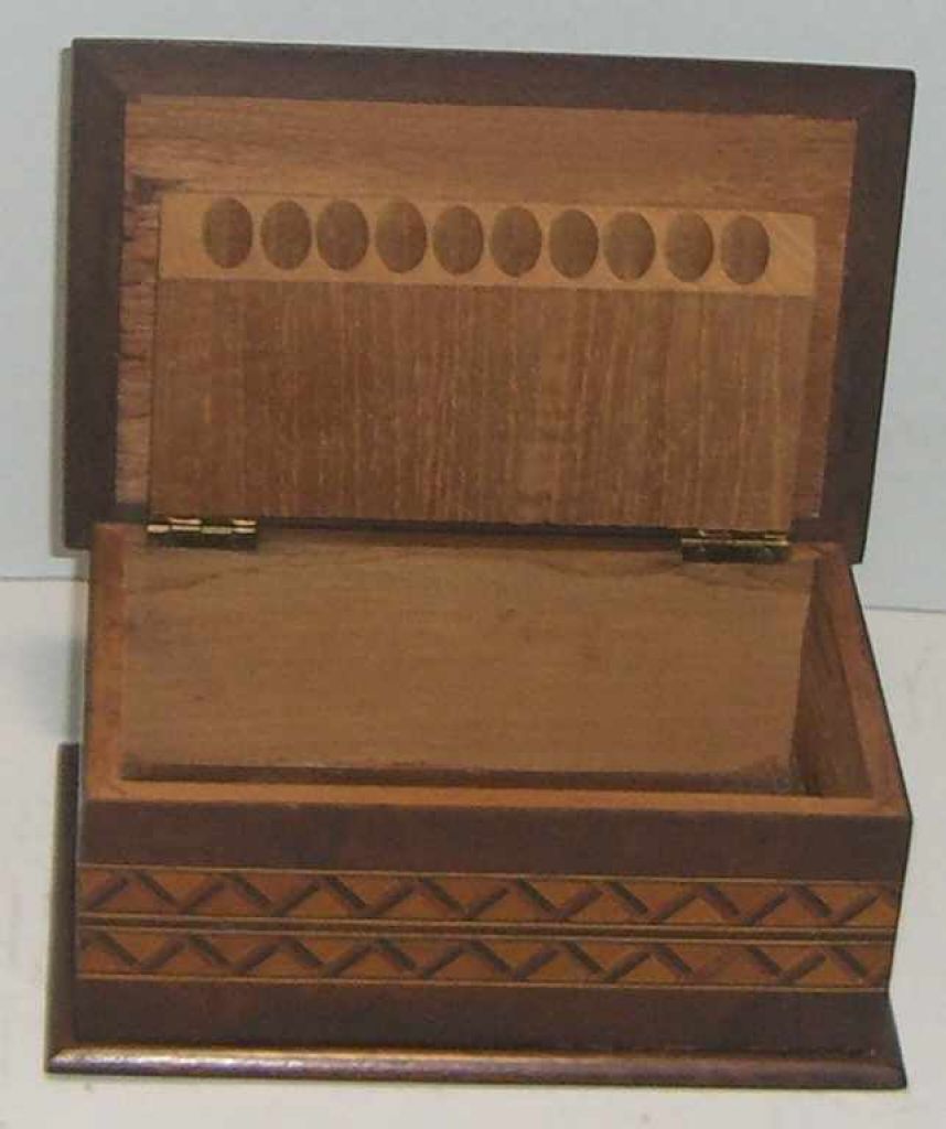 Marquetry Top Wooden Covered Cigarette Box w/Individual Cigarette Inside Top. 4 1/4" width x 6 1/2" length x 2 2/3" height Marquetry Top Wooden Covered Cigarette Box w/Individual Cigarette Inside Top. 4 1/4" width x 6 1/2" length x 2 2/3" height