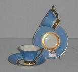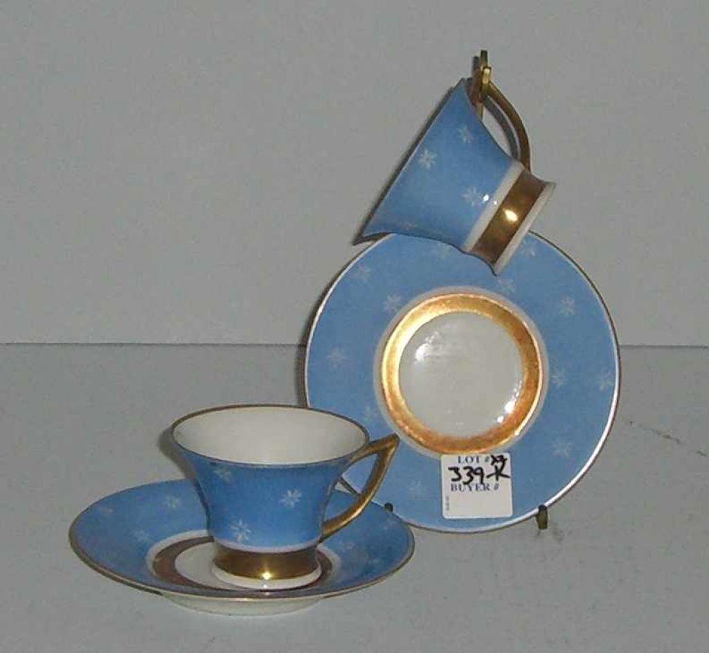 A pair of Handmalat Hackefors Sweden cups & saucers. Blue, white, & gold. Cup 2 1/2" tall, saucer 4 1/2" round A pair of Handmalat Hackefors Sweden cups & saucers. Blue, white, & gold. Cup 2 1/2" tall, saucer 4 1/2" round