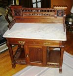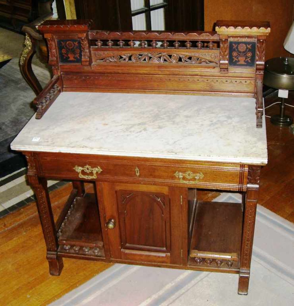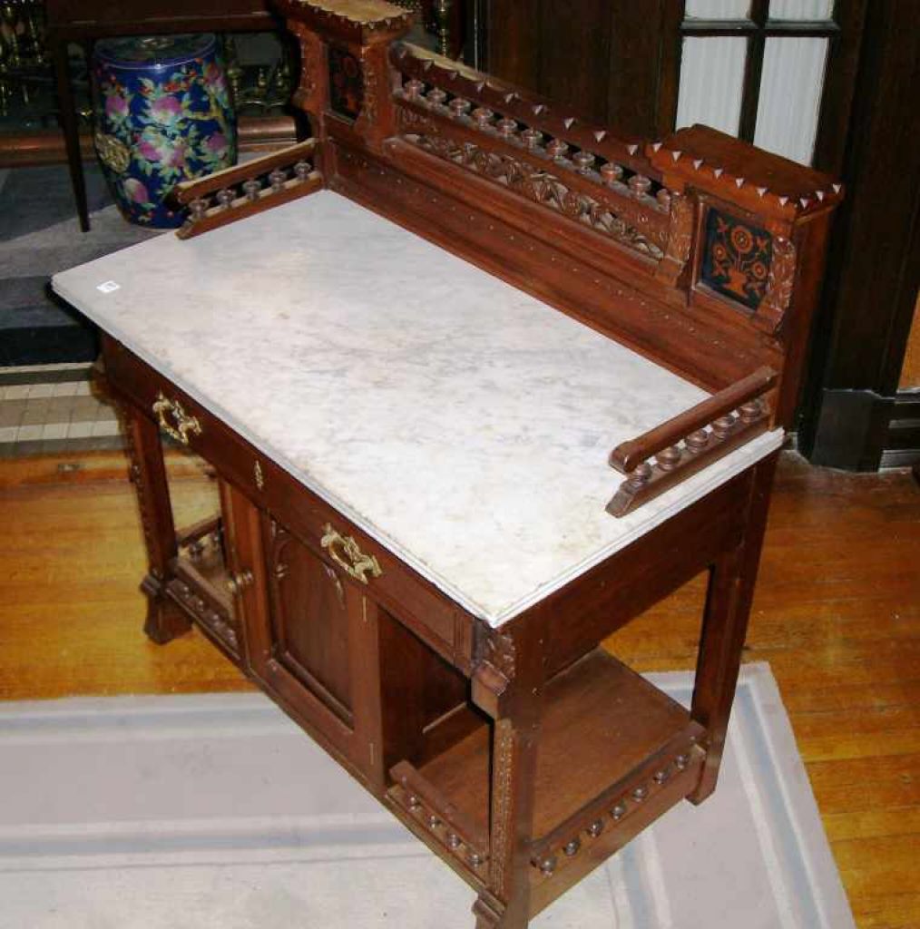 Walnut marble top washstand with carved splash back Walnut marble top washstand with carved splash back