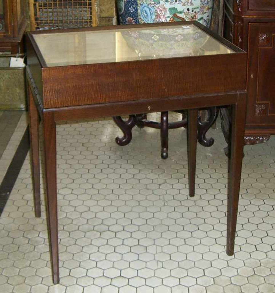 Mahogany lift top vitrine with tapered legs - 27 1/4" tall by 24" wide by 18 1/4" deep Mahogany lift top vitrine with tapered legs - 27 1/4" tall by 24" wide by 18 1/4" deep