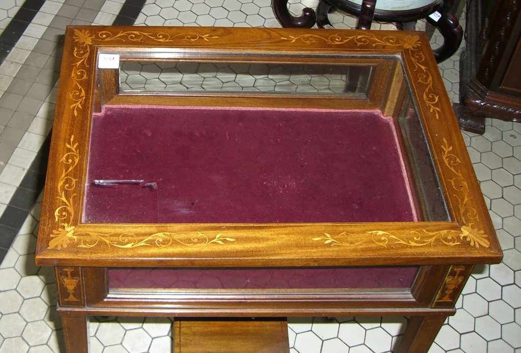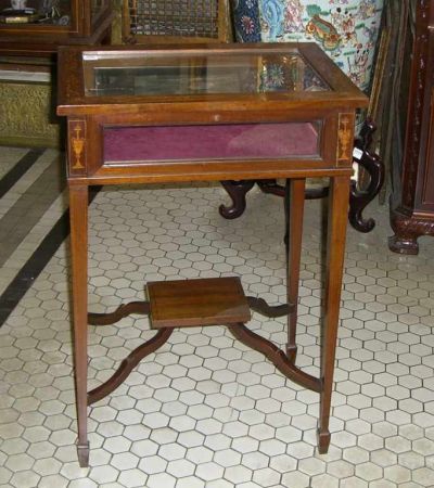 Small lift top display stand with cross stretcher base mahogany with inlay - 27 3/4" tall by 19 1/2" wide by 14 1/2" deep Small lift top display stand with cross stretcher base mahogany with inlay - 27 3/4" tall by 19 1/2" wide by 14 1/2" deep