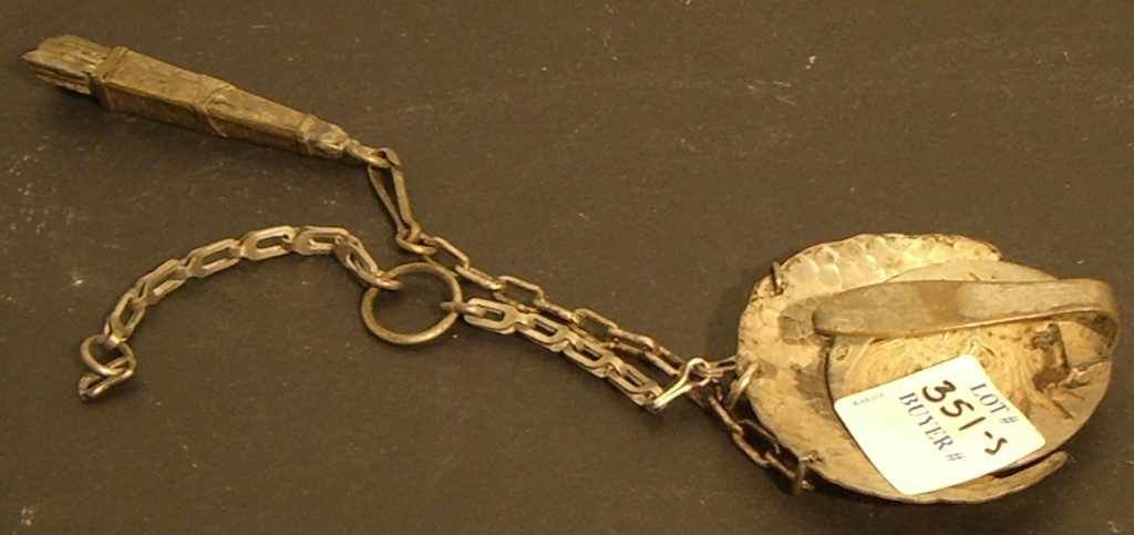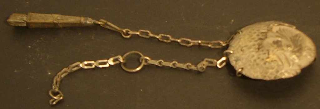 Ornate metal chateleine with rooster motif Ornate metal chateleine with rooster motif
