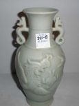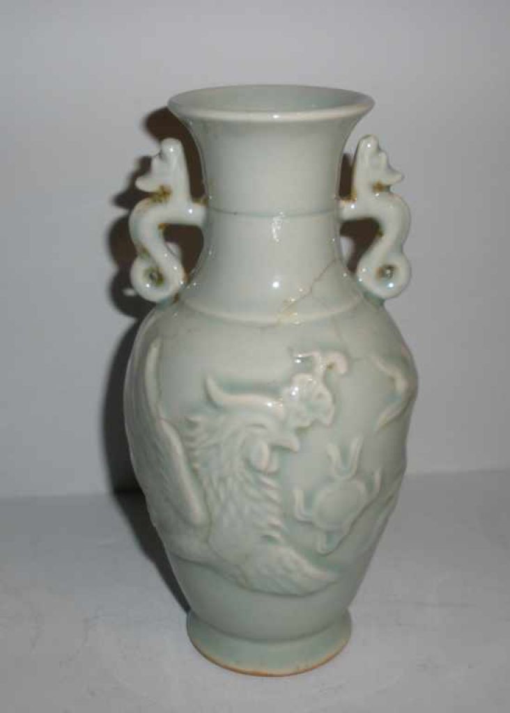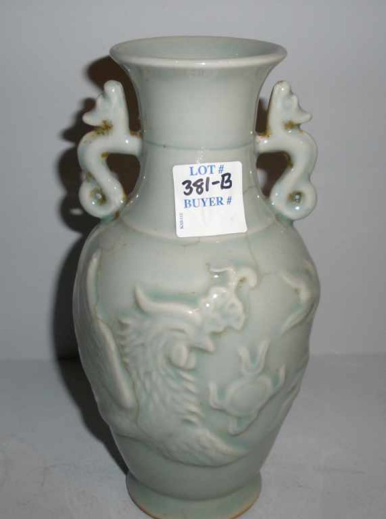 Celadon Glaze Bottle Shape Figural Vase Handle Emboss w/Long Tail Fowl. 4" diameter of center of vase, 7 1/2" tall Celadon Glaze Bottle Shape Figural Vase Handle Emboss w/Long Tail Fowl. 4" diameter of center of vase, 7 1/2" tall