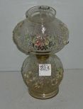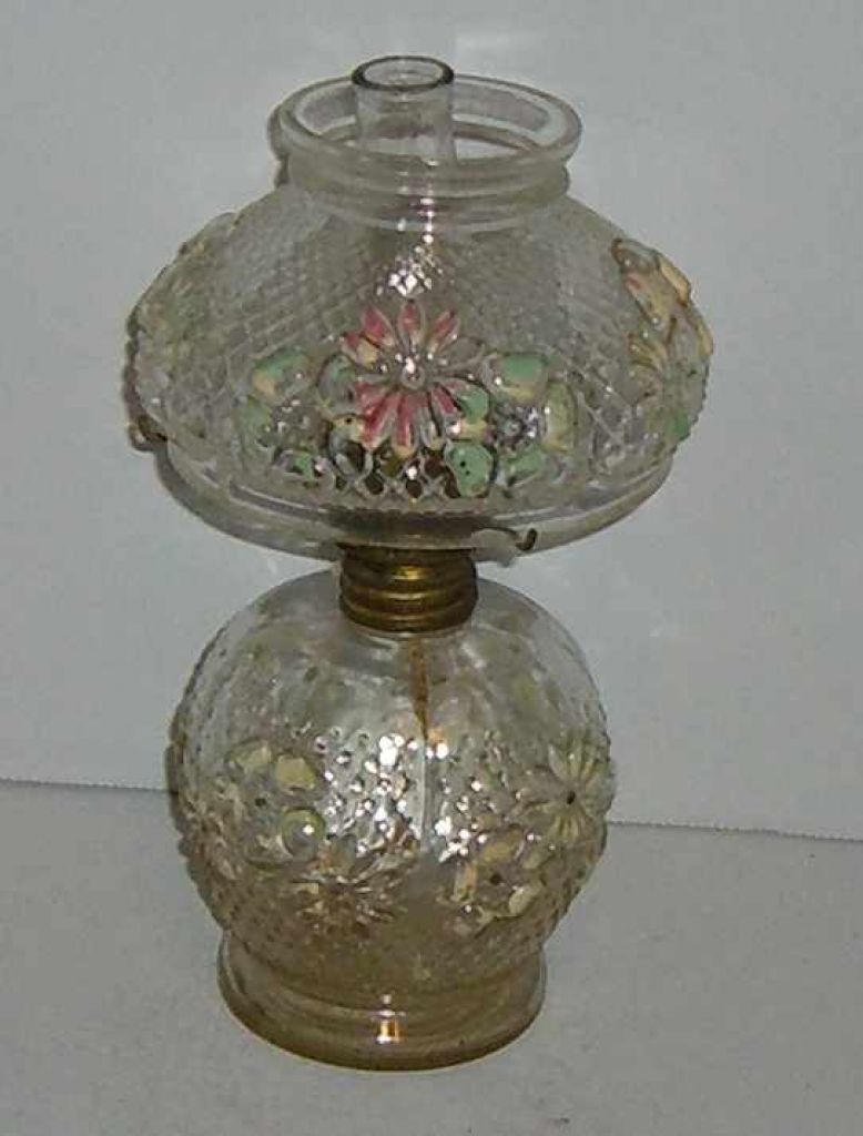 Small pressed clear glass oil lamp with raised hand painted flowers. Consolidated Glass "Cosmos" Pattern - 4 1/2" round by 8" tall Small pressed clear glass oil lamp with raised hand painted flowers. Consolidated Glass "Cosmos" Pattern - 4 1/2" round by 8" tall