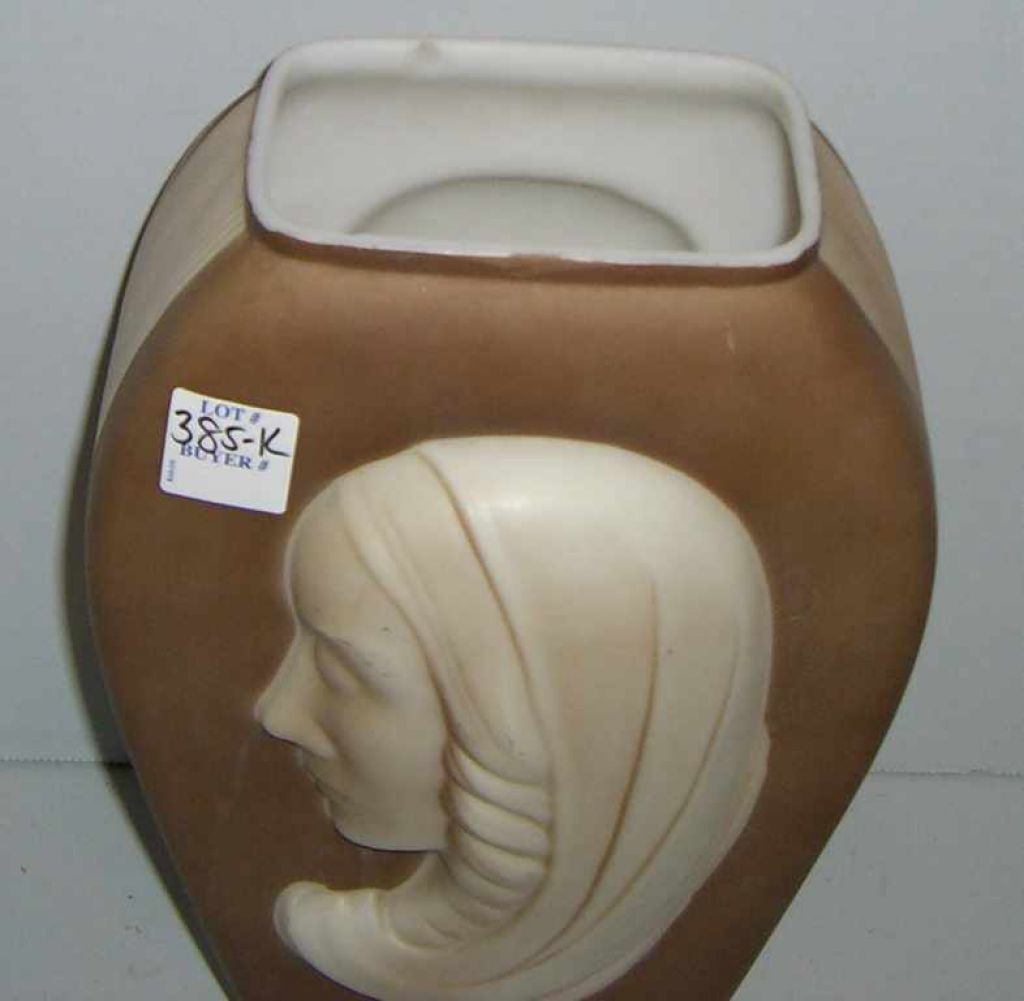 Phoenix glass "Madonna" vase with brown shadows - 7" by 5 1/2" by 11". HAS A CHIP ON TOP OF RIM. Phoenix glass "Madonna" vase with brown shadows - 7" by 5 1/2" by 11". HAS A CHIP ON TOP OF RIM.