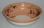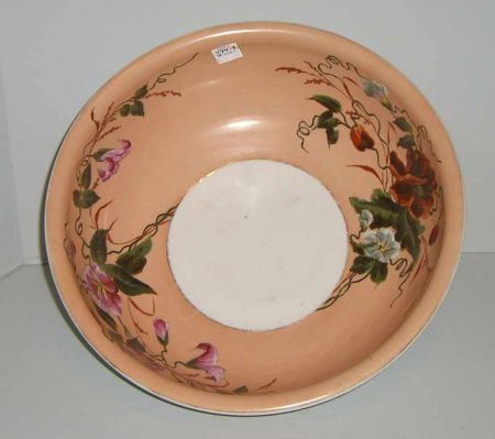 Large peach and white with gold trim bowl. Enameled flowers on inside - 14" round by 5" tall Large peach and white with gold trim bowl. Enameled flowers on inside - 14" round by 5" tall