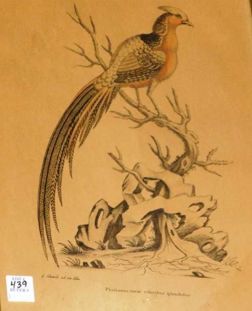 Ebonized frame hand painted bird print. Ebonized frame hand painted bird print.