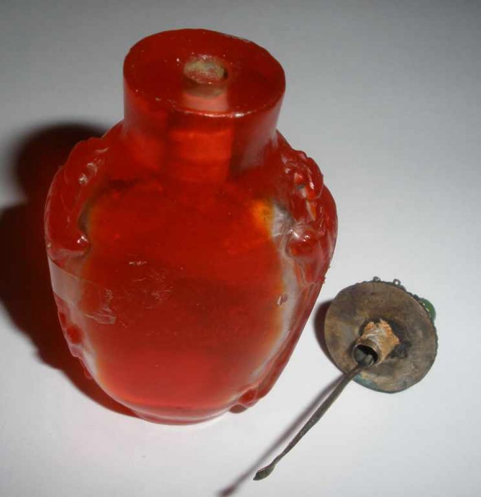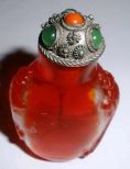 Peking Snuff Bottle - Embossed Creature, Red w/Jewel Stopper. 1 1/2" width x 2 2/3" height Peking Snuff Bottle - Embossed Creature, Red w/Jewel Stopper. 1 1/2" width x 2 2/3" height