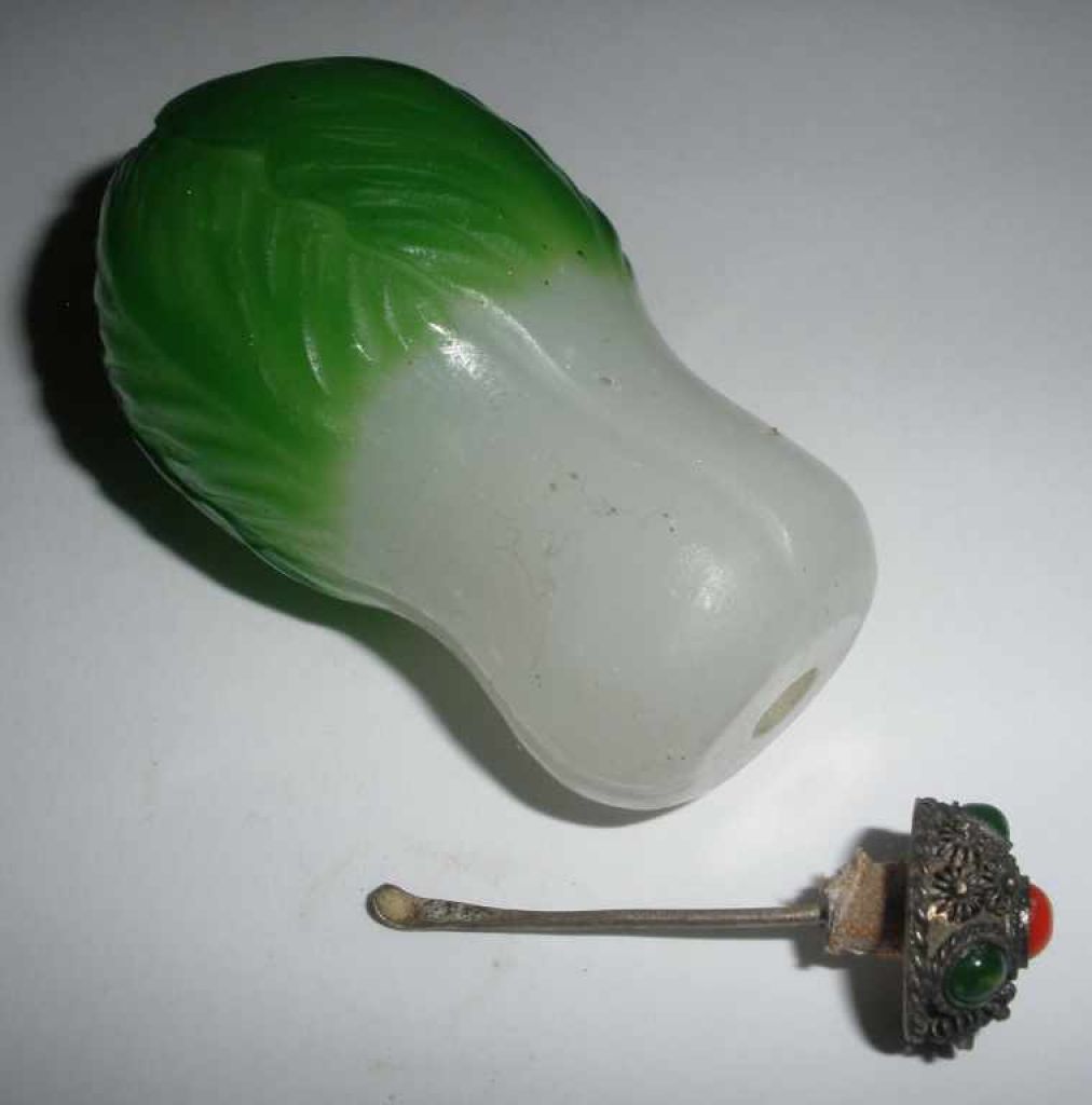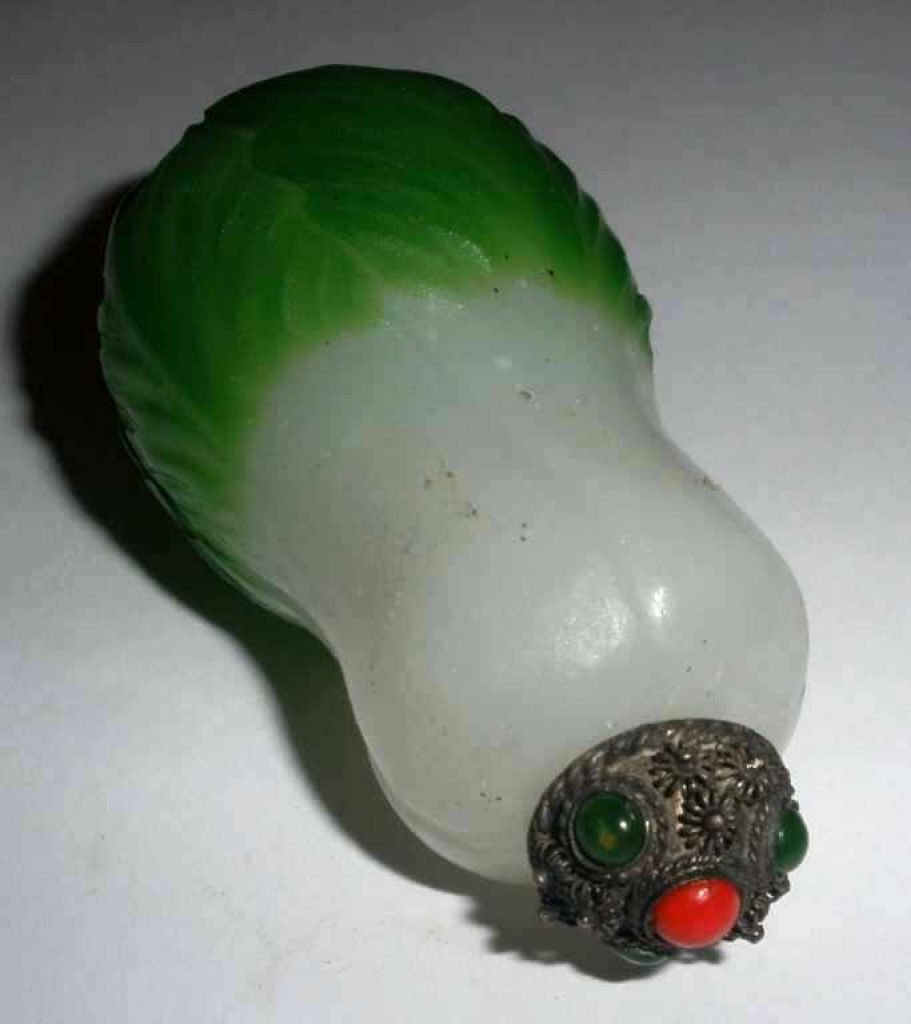 Peking Snuff Bottle - Embossed Boc Choy, Green and White. 1 1/2" width x 2 2/3" height Peking Snuff Bottle - Embossed Boc Choy, Green and White. 1 1/2" width x 2 2/3" height