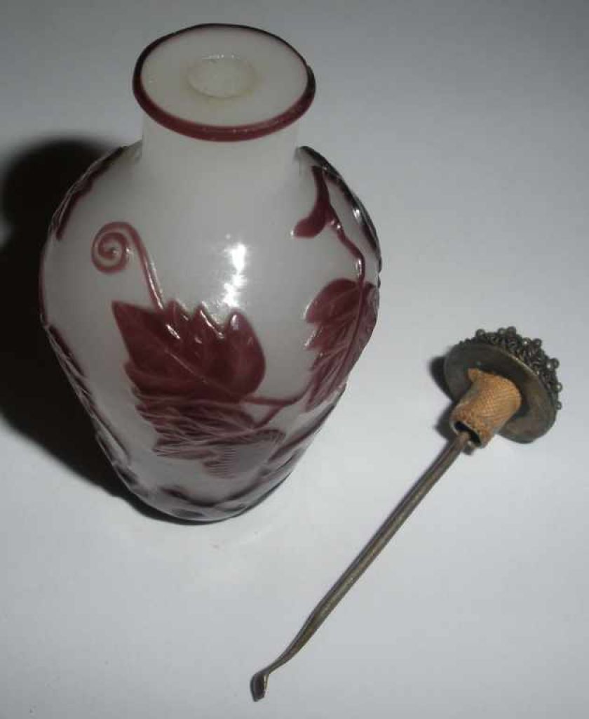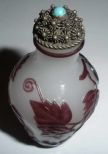 Peking Snuff Bottle - Cameo Purple Cut to White, Jeweled Stopper. 1 1/4" width x 2 1/2" height Peking Snuff Bottle - Cameo Purple Cut to White, Jeweled Stopper. 1 1/4" width x 2 1/2" height