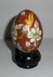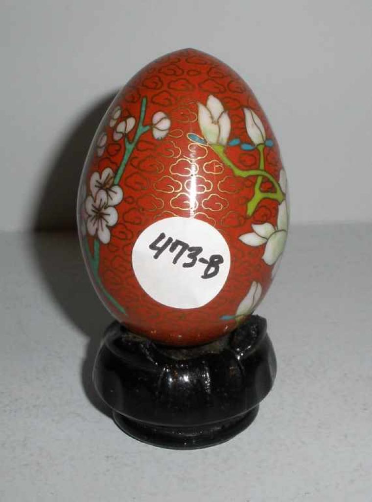 Cloisonne Egg w/Bird and Floral Decorations, Ebonized Stand. Egg 1 2/3" width x 2 2/3" height, stand 1 1/2" diameter x 2/3" height Cloisonne Egg w/Bird and Floral Decorations, Ebonized Stand. Egg 1 2/3" width x 2 2/3" height, stand 1 1/2" diameter x 2/3" height