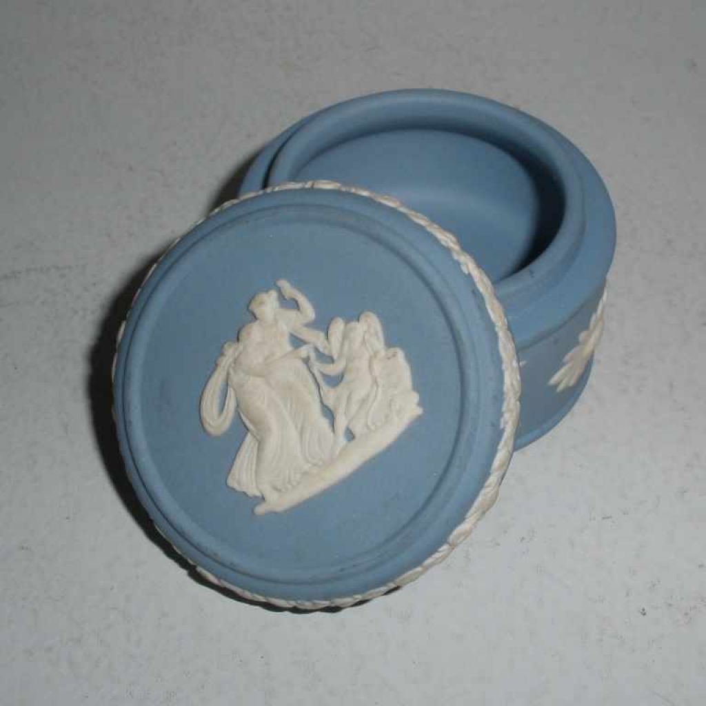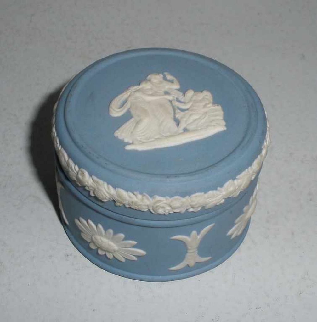 Wedgwood Blue and White Jasperware, Small Cover Rouge Box. 1 1/2" diameter x 1 1/4" tall Wedgwood Blue and White Jasperware, Small Cover Rouge Box. 1 1/2" diameter x 1 1/4" tall