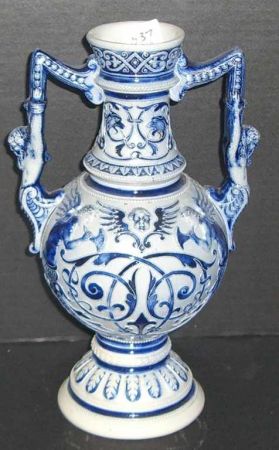 German Stoneware Double Handled Vase - Cobalt on Gray. German Stoneware Double Handled Vase - Cobalt on Gray.