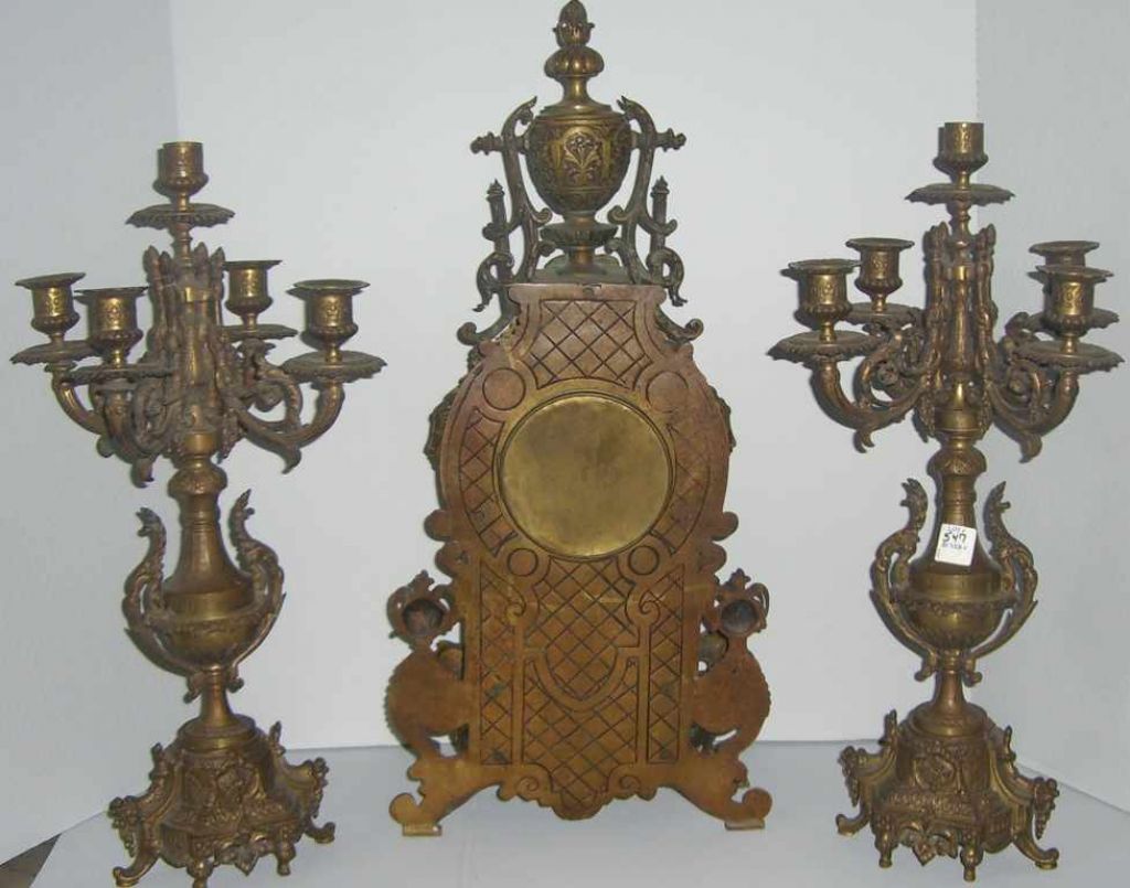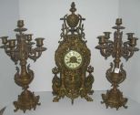 3430 Large Ornate 3 Piece Bronze Clock Set w/5 Light Candelabras