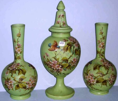 3 Piece Chartreuse Mantel Garniture Set w/Enamel Birds. 3 Piece Chartreuse Mantel Garniture Set w/Enamel Birds.