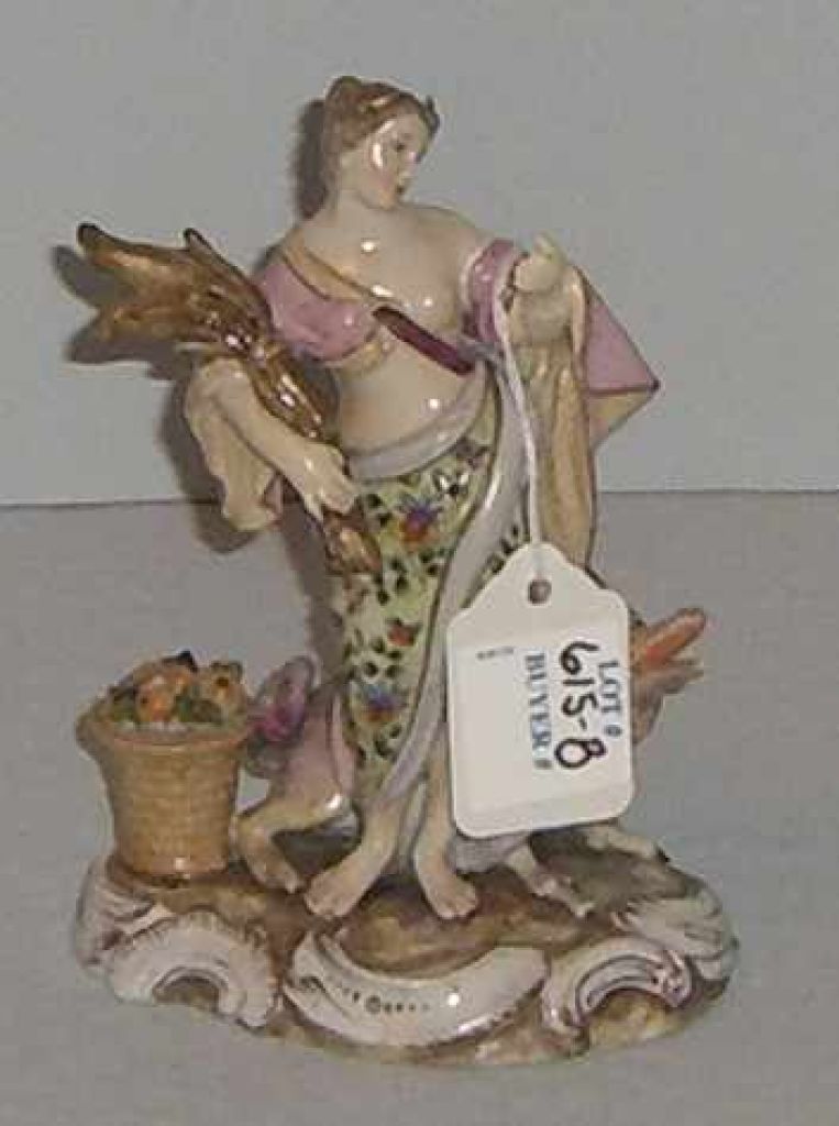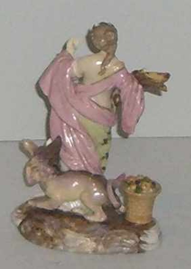 Probably Meissen Very Detailed Figural Lady Holding Wheat w/Winged Dragon Behind Basket of Fruit - 6" tall x 4" across base. Probably Meissen Very Detailed Figural Lady Holding Wheat w/Winged Dragon Behind Basket of Fruit - 6" tall x 4" across base.