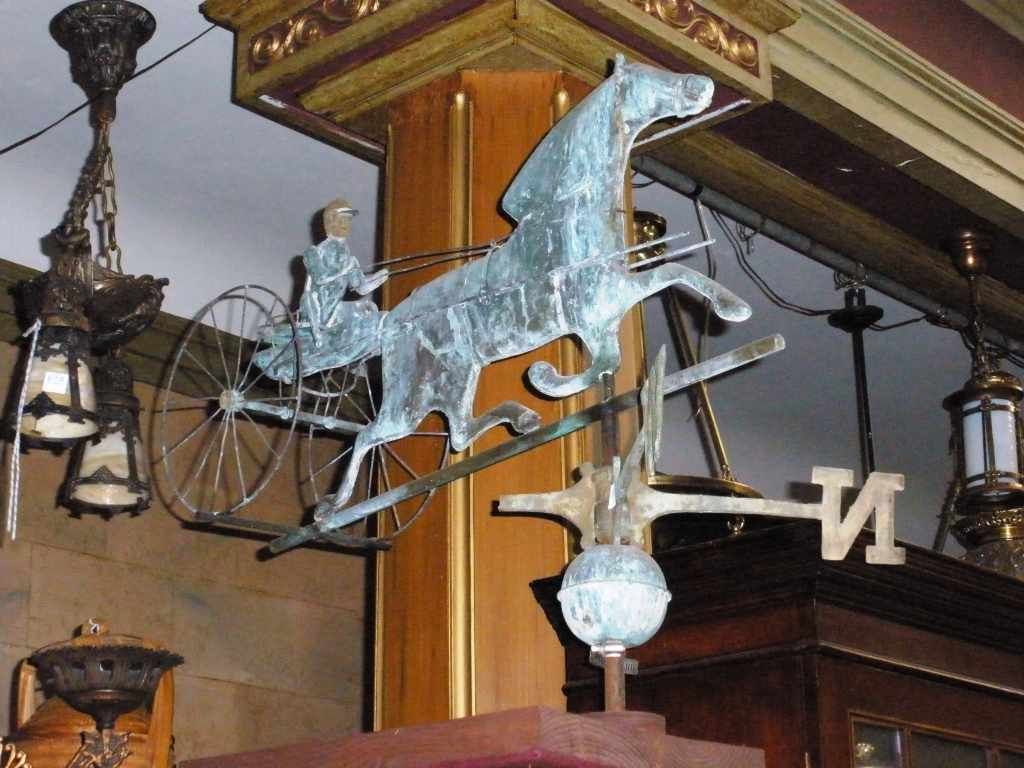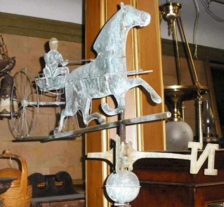 Copper Weather Vane of Horse Pulling Sulky with Driver. 37" long. Copper Weather Vane of Horse Pulling Sulky with Driver. 37" long.