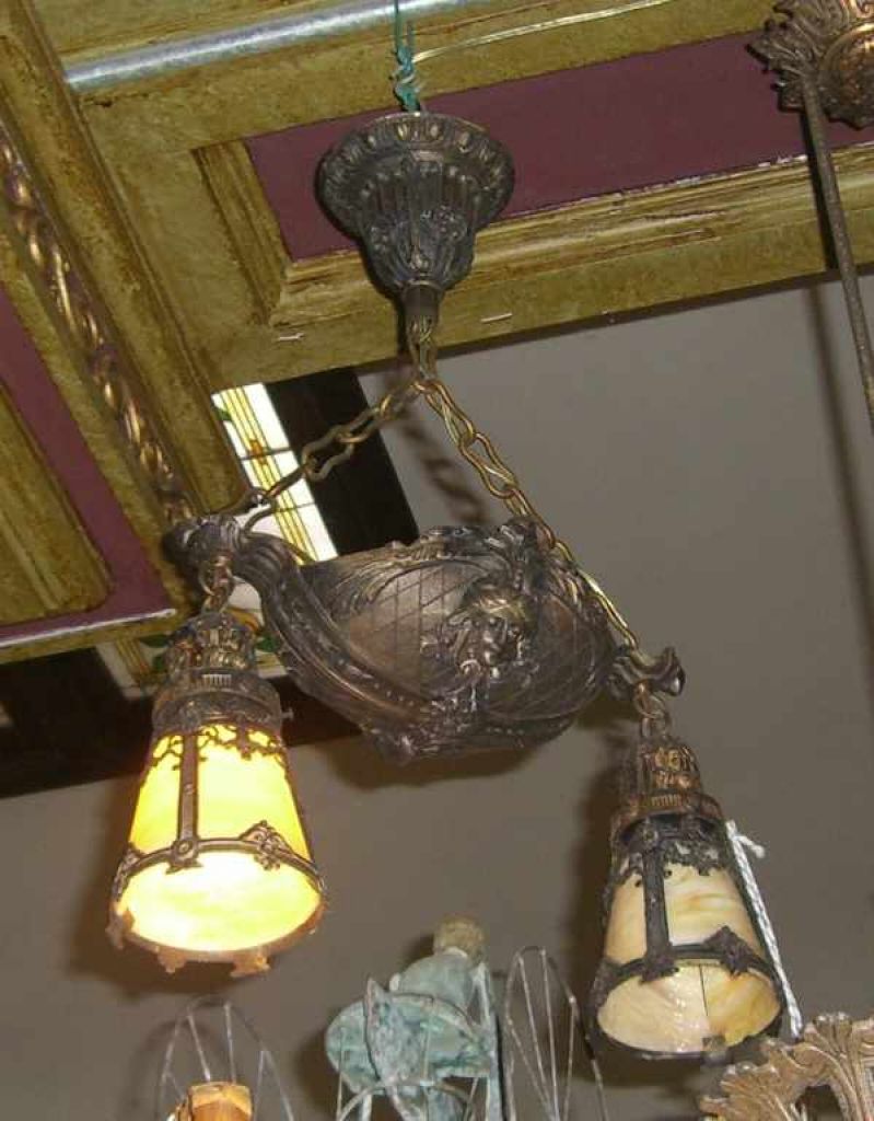 Harrison Co. 2 Light Bronze Art Nouveau Chandelier w/Slag Glass Harrison Co. 2 Light Bronze Art Nouveau Chandelier w/Slag Glass