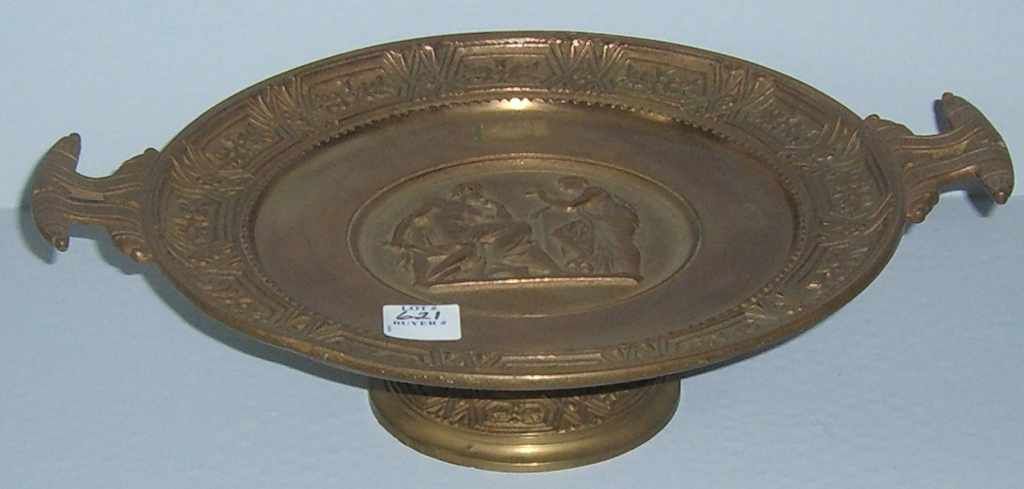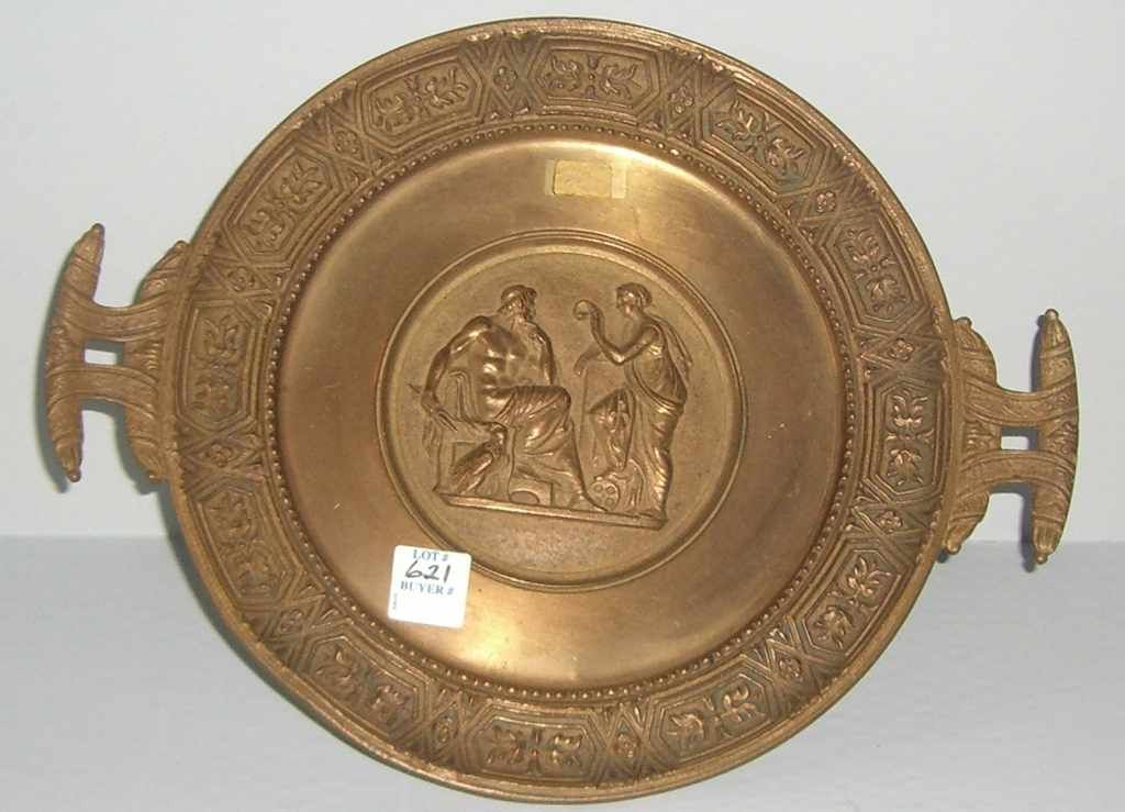 Large bronze double handled taza w/classical scene. Large bronze double handled taza w/classical scene.