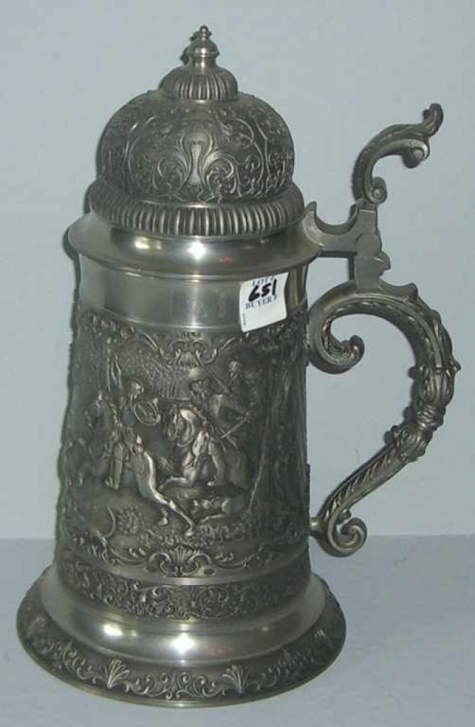 Large Pewter Stein with Embossed Figural. Large Pewter Stein with Embossed Figural.