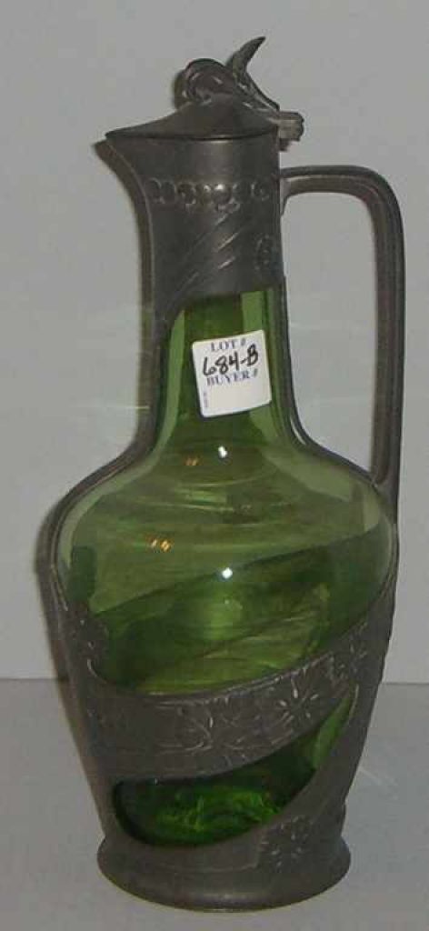 Green Glass Decanter w/Art Nouveau Pewter Overlay - 11 1/2" tall Green Glass Decanter w/Art Nouveau Pewter Overlay - 11 1/2" tall