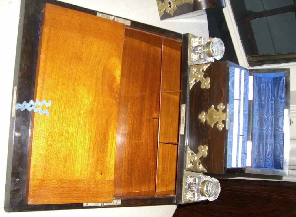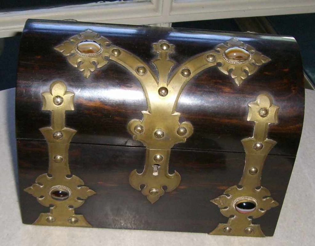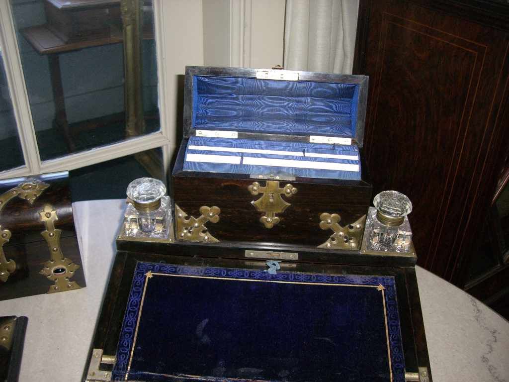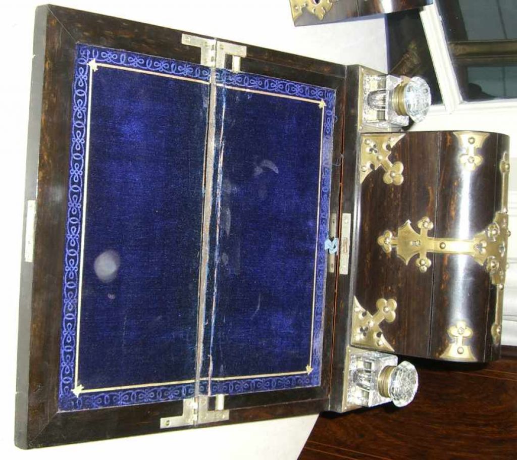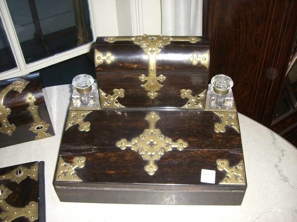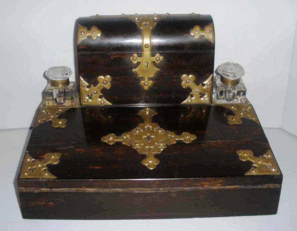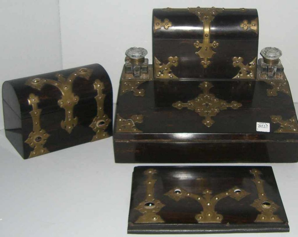 Coromandel 3 Piece Desk Set w/Ornate Brass Fittings and Mounted Tiger Eye Stones - Consists of Writing Box Ink Stand, Letter Holder and Departmentalized Box. Coromandel 3 Piece Desk Set w/Ornate Brass Fittings and Mounted Tiger Eye Stones - Consists of Writing Box Ink Stand, Letter Holder and Departmentalized Box.