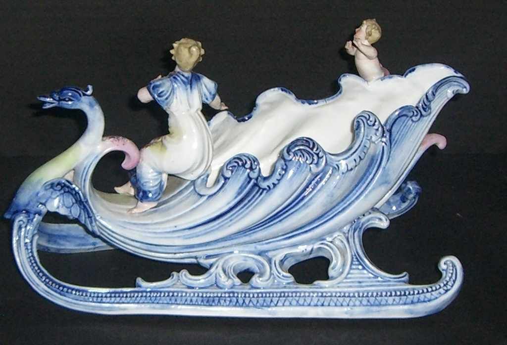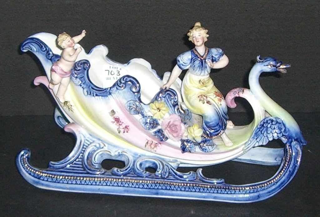 Porcelain Sleigh Flow Blue and Figural w/Floral - 10 1/4" Porcelain Sleigh Flow Blue and Figural w/Floral - 10 1/4"