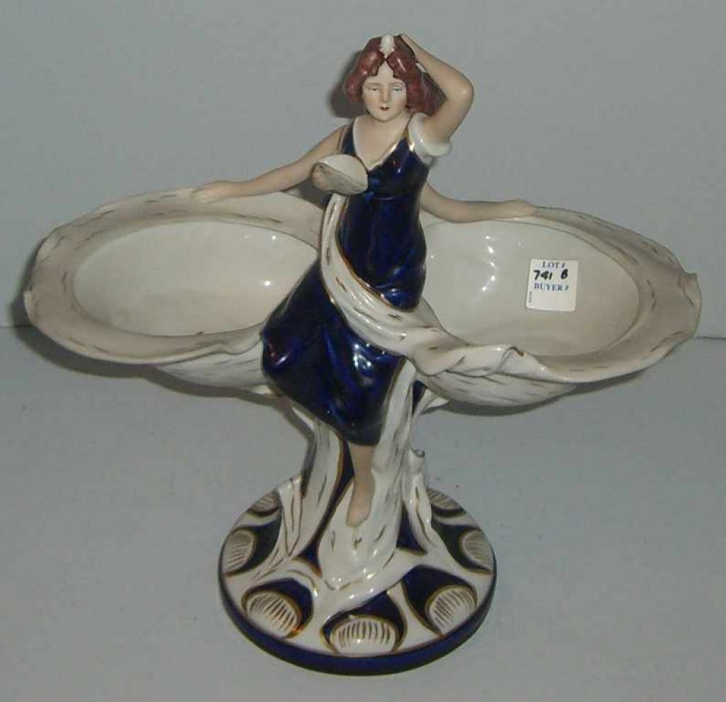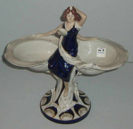 Royal Dux Art Deco Double Maiden Oyster Shell Shaped Dish on Either Side - 13" tall x 12 1/2" across. Royal Dux Art Deco Double Maiden Oyster Shell Shaped Dish on Either Side - 13" tall x 12 1/2" across.