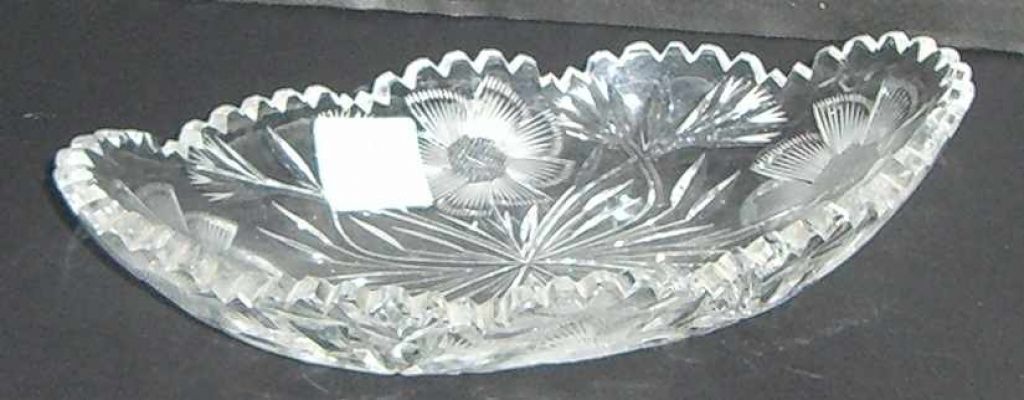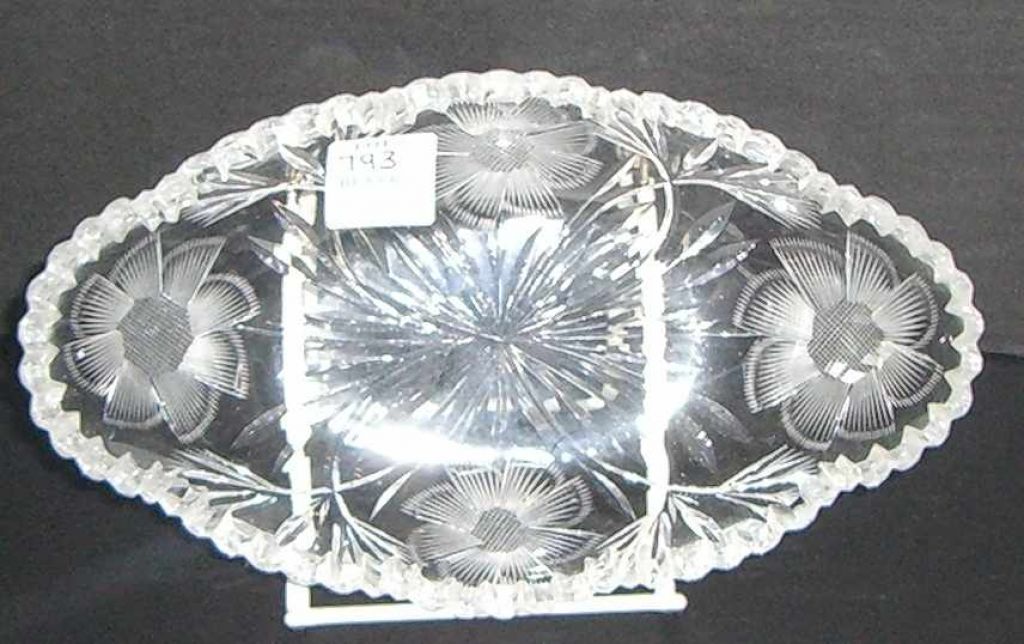 Cut glass oval pickle dish w/engraved floral - 8 7/8" long Cut glass oval pickle dish w/engraved floral - 8 7/8" long
