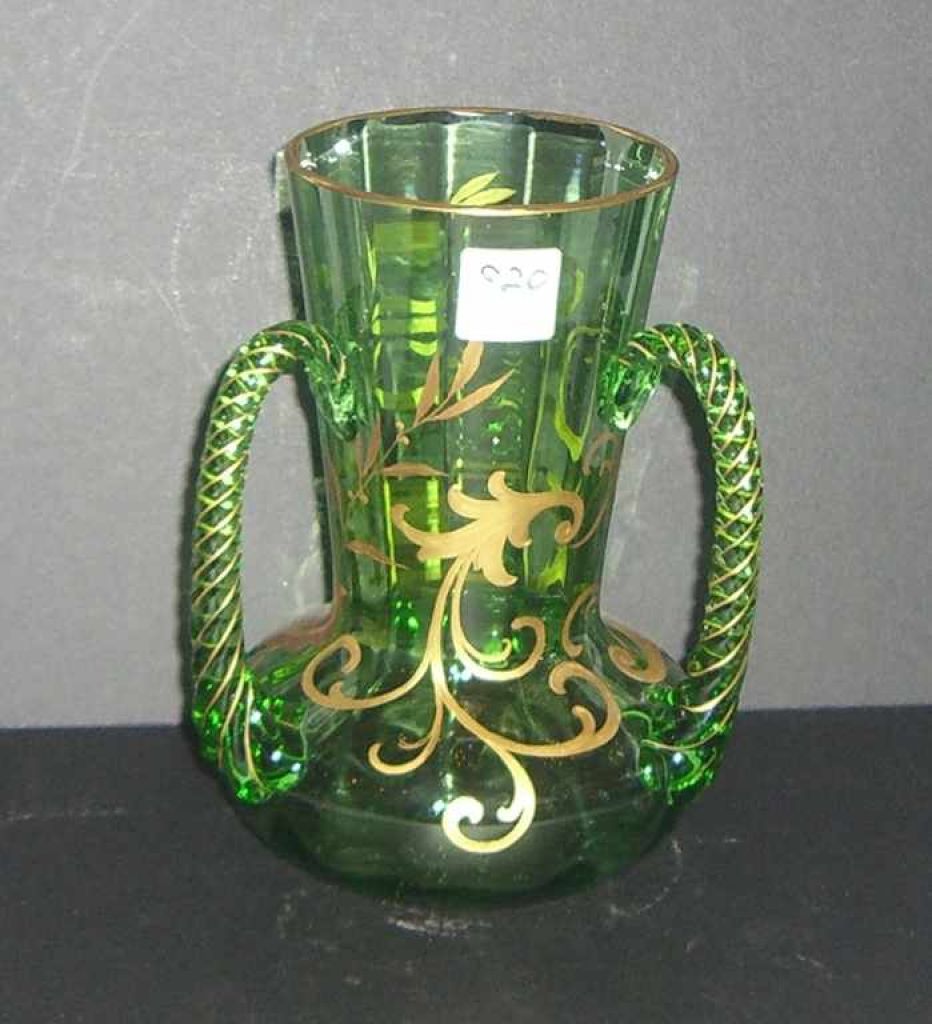 Green glass enameled 3 handle loving cup with large flared mouth - 5 1/2" round by 8" tall Green glass enameled 3 handle loving cup with large flared mouth - 5 1/2" round by 8" tall