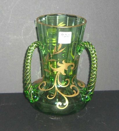 3872 Green glass enameled 3 handle loving cup with large flared mouth