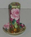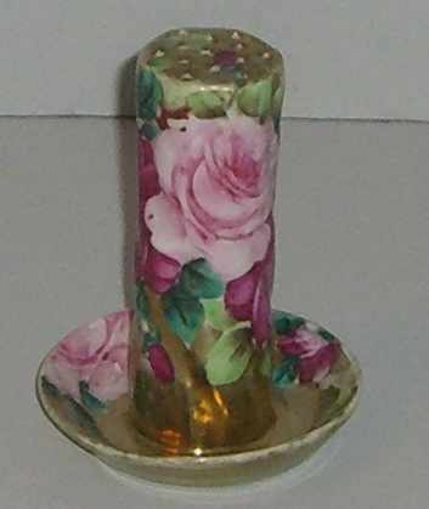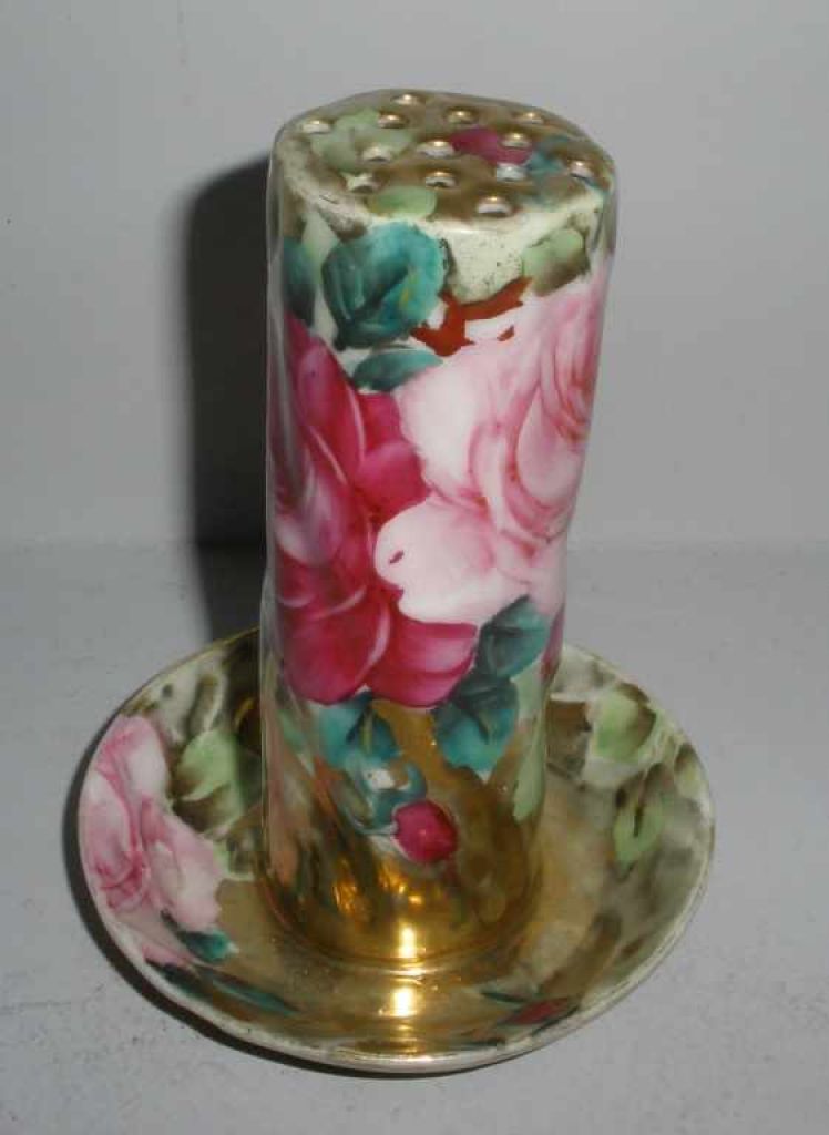 Nippon gold with roses hat pin holder. 3 1/8" wide base, 4" tall Nippon gold with roses hat pin holder. 3 1/8" wide base, 4" tall